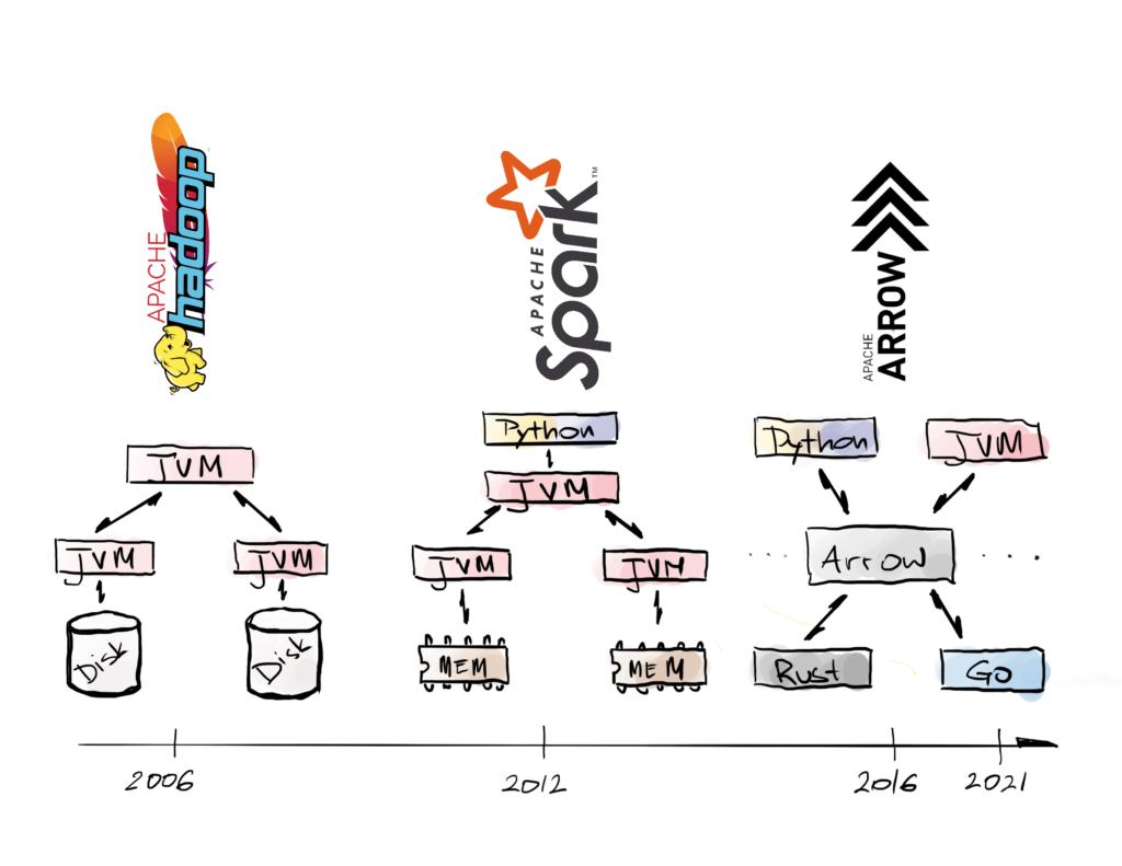 In late 2014, I joined Cloudera and started working closely with the Apache Impala and Apache Kudu teams there led by Marcel Kornacker and Todd Lipcon, respectively. We were interested in building an intuitive and fast developer experience for Python programmers (and pandas users, in particular) on top of large-scale distributed storage and data processing engines. One glaring issue was the absence of a standardized, high-speed column-oriented “data protocol” for transporting data efficiently between engines and programming languages. We didn’t want to create a custom data format for our use case nor use data serialization technology like Google’s Protocol Buffers or Apache Thrift because those introduced too much computational overhead. We began designing a new columnar data format but knew that if it was a primarily Cloudera-led project it might risk not succeeding in the highly political climate of big data open source projects.