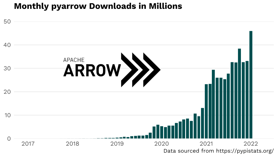 Apache Arrow’s popularity is constantly growing. In fact, PyArrow, Arrow’s Python library, was downloaded 46 million times in January 2022, almost 8 million more downloads than in October 2021, the previous record. We expect this trend to continue as more and more projects adopt Arrow as a dependency.