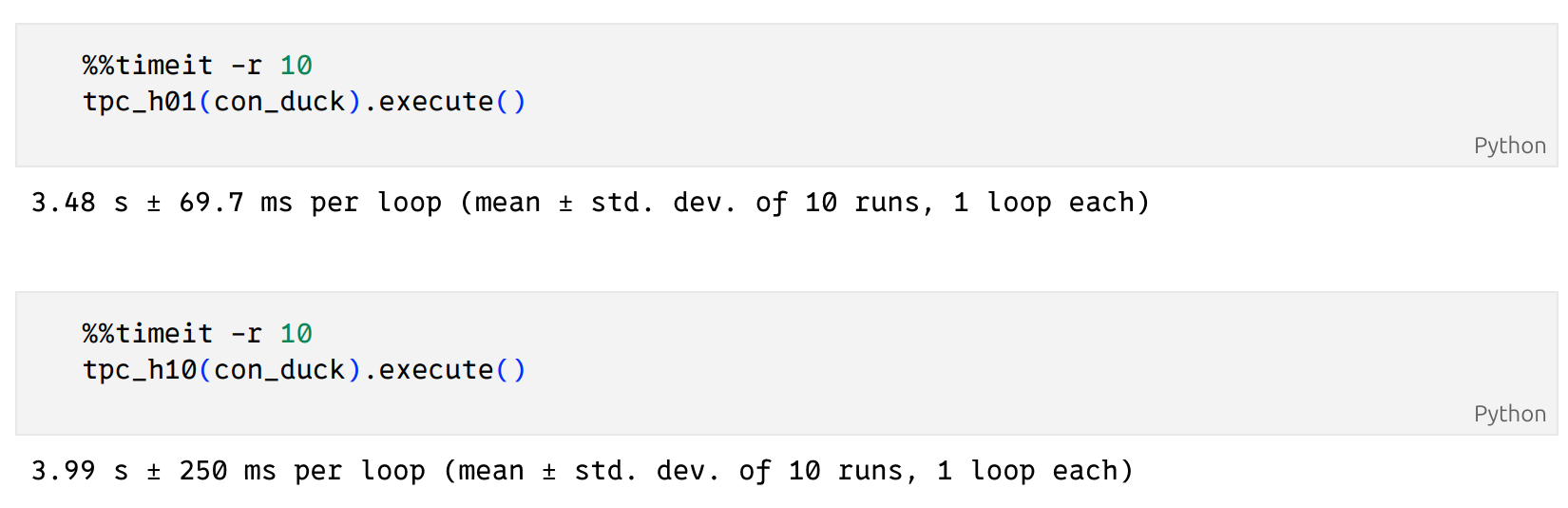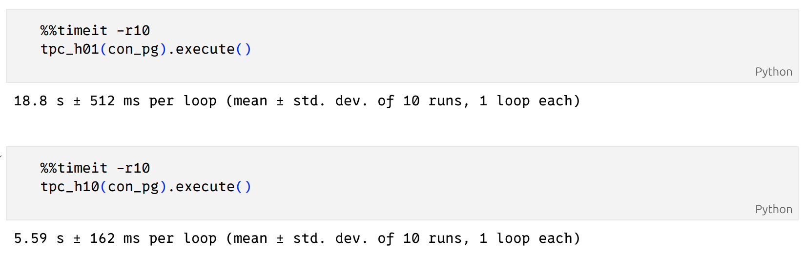 con_duck.list_tables() ['nation', 'customer', 'orders', 'lineitem']We can now pass the connection object directly to our functions and measure their execution time: