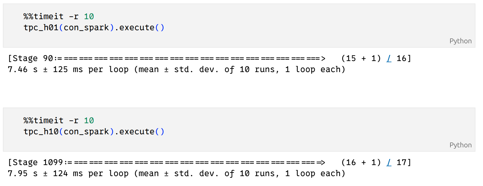 con_spark.register("/home/francois/datasets/tpc-h-10GB/parquet/nation.parquet", table_name="nation")As with the two other backends, we can time how long it takes for these queries to run on Spark: