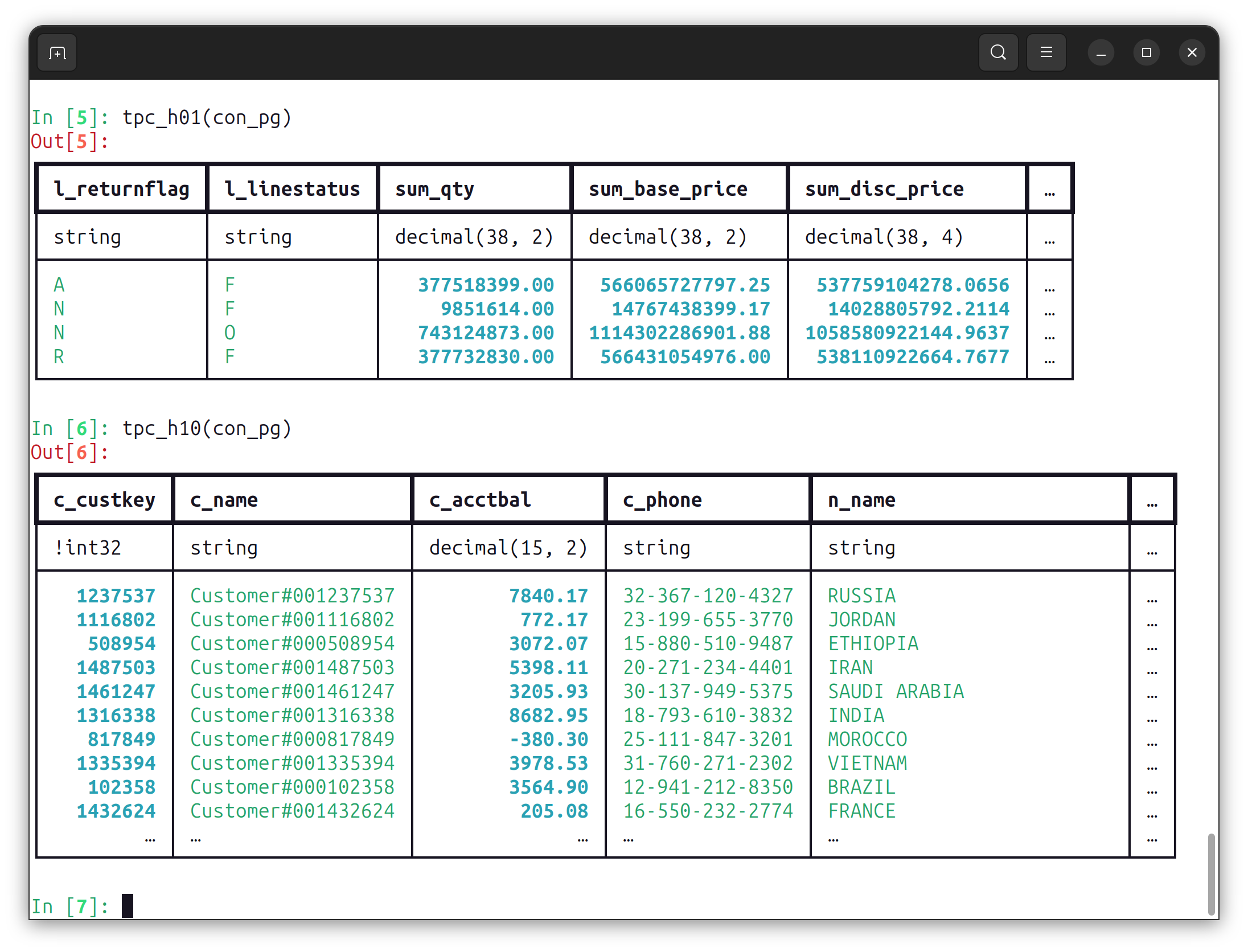 con_pg = ibis.postgres.connect(database='tpc-h-10gb', host='localhost', user=pg_user, password=pg_pwd)Once the connection is established, we can pass it to our functions and check that the outputs look as expected. In this post, we only show the output for the Postgres backend but the other backends produce the same output. Don’t be alarmed if you cannot make sense of the ‘comments’ and ‘address’ fields in the output of Q10. The data used by the TPC-H test suite is generated to have the attributes of realistic business data but some string fields are actually made up of gibberish text.