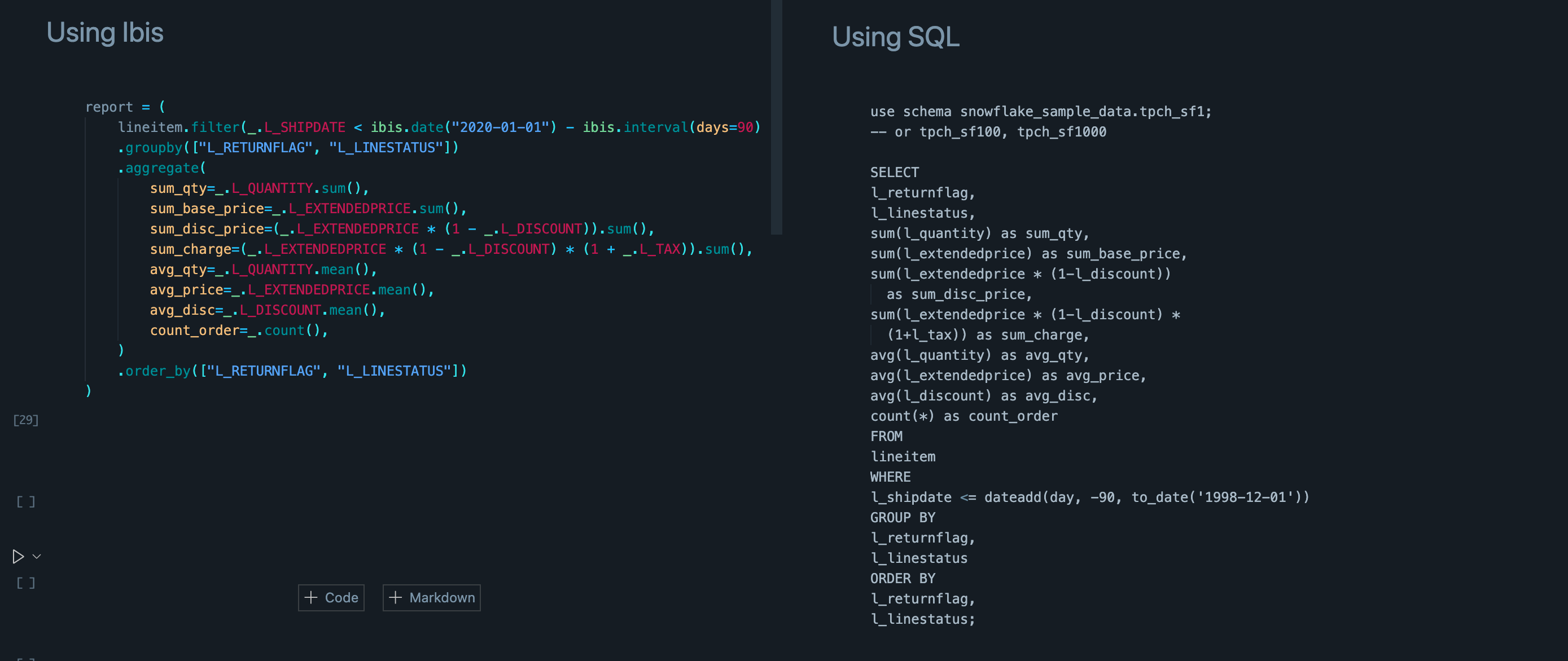 As an example of what using Ibis and Snowflake together looks like, we’ll prepare a short pricing summary report. We’ll work with Ibis in a Jupyter notebook in our local IDE to connect to Snowflake and grab a table that has information about a business’s shipping, sales, and returns data. We’ll generate a pricing summary report that helps us understand how the business performed in a certain time interval. Let’s start by installing the Ibis-Snowflake backend using the code below.