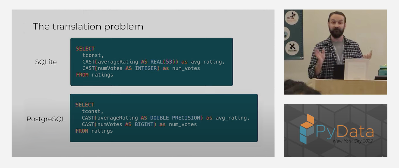 At around the 24-minute mark in the video, Gil shows how seamless it is to run the same Ibis code against three different database management systems — and he does this in about 30-seconds.