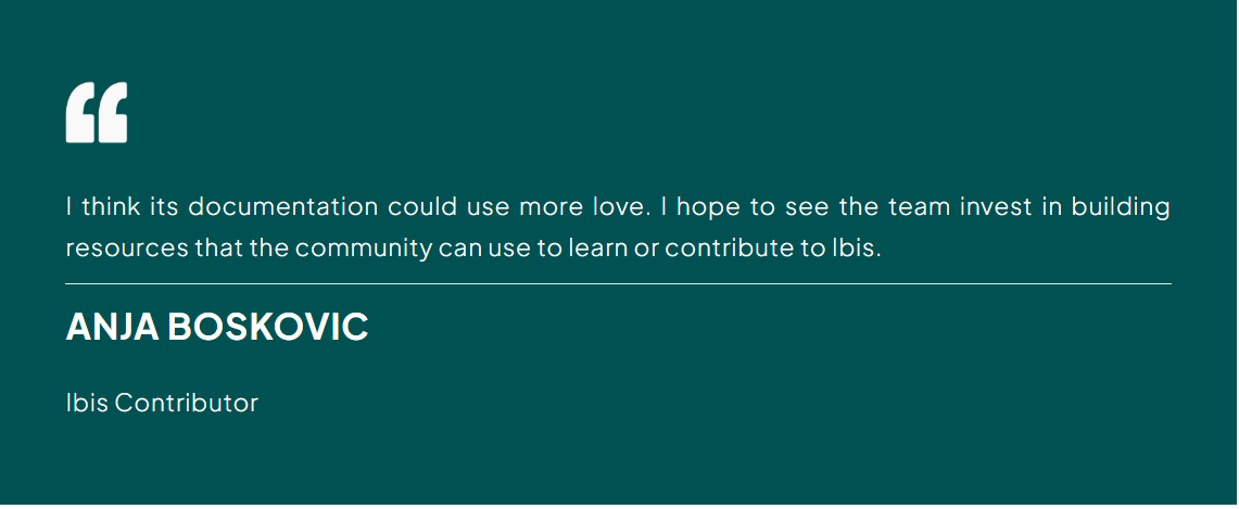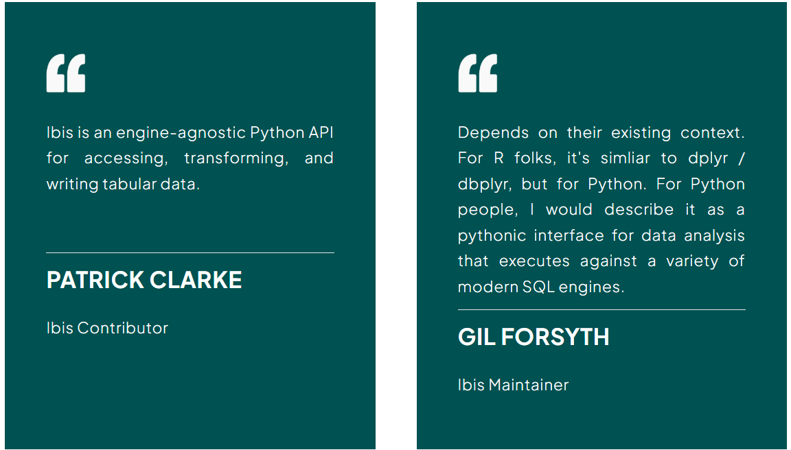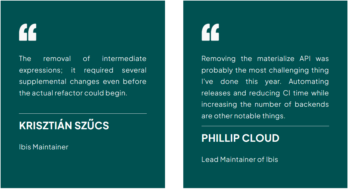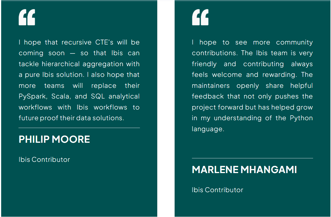 We caught up with key Ibis maintainers and contributors to learn about the progress made last year and what’s in store for the Ibis 4.0 release slated for January 2023. During our conversations, one sentiment was abundantly clear: the team wants to grow the community and see more individual contributions over the next year. Read on to get an inside look at what it’s like to work on Ibis.