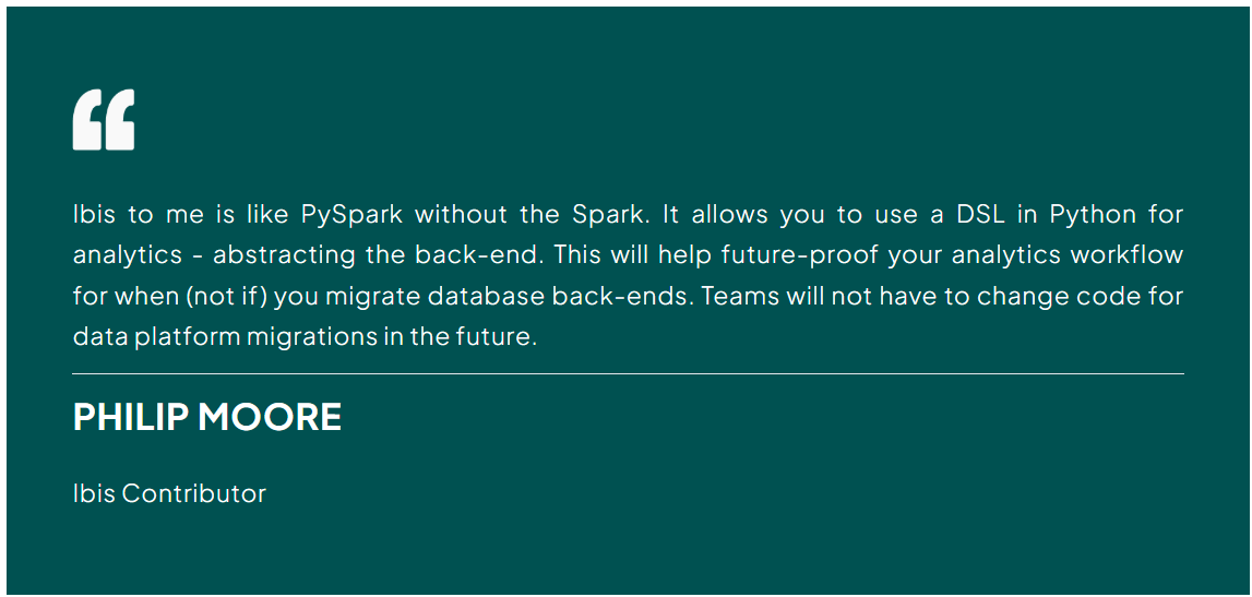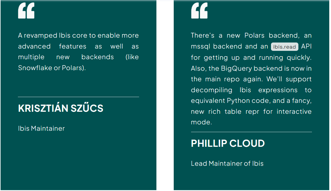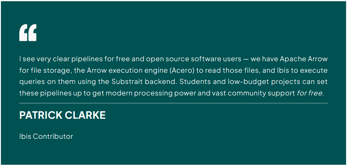As Ibis’ core continues to be revamped, we are already seeing changes such as the addition of the Polars and Snowflake backends that Phillip and Krisztian mentioned. Additionally, as ibis-substrait matures, it will become easier than ever to utilize Substrait consumers like Acero through Python, creating those free and open source data pipelines that can be immensely valuable to research and development.