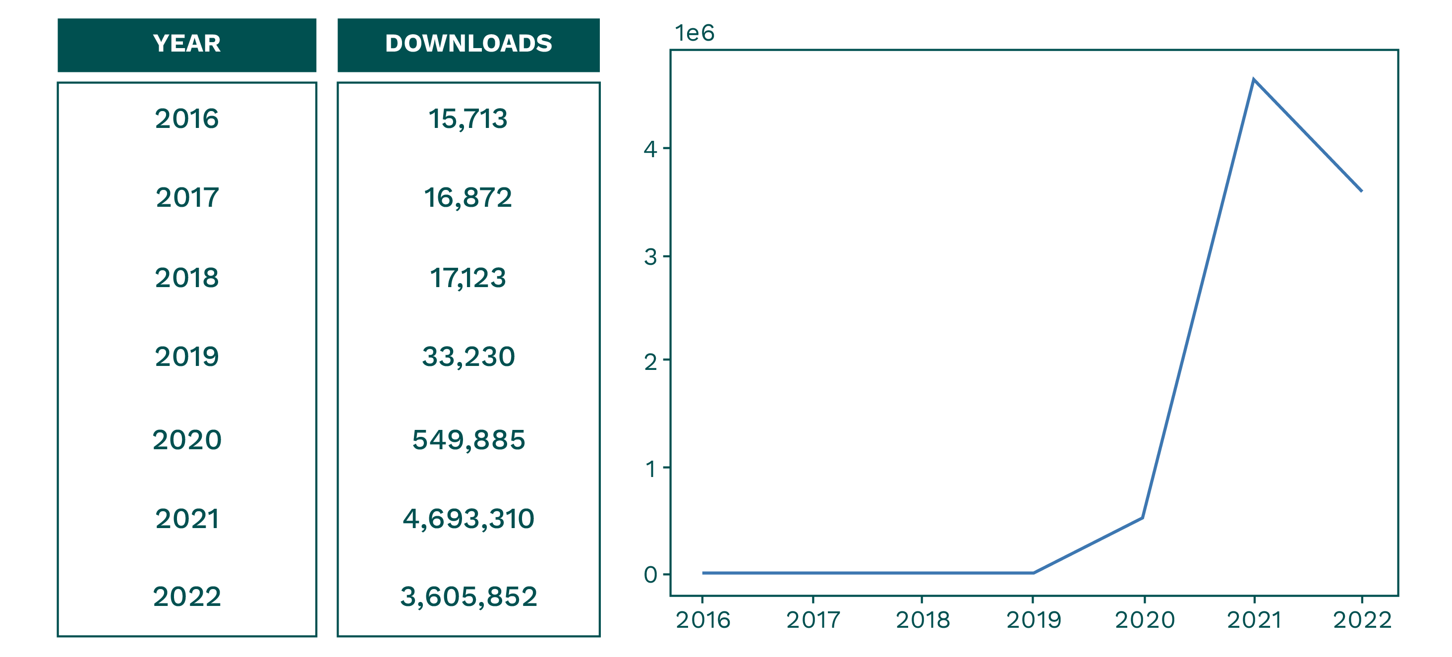 Downloads table 2016-2022 (Datasource: PyPI Big Query Dataset)