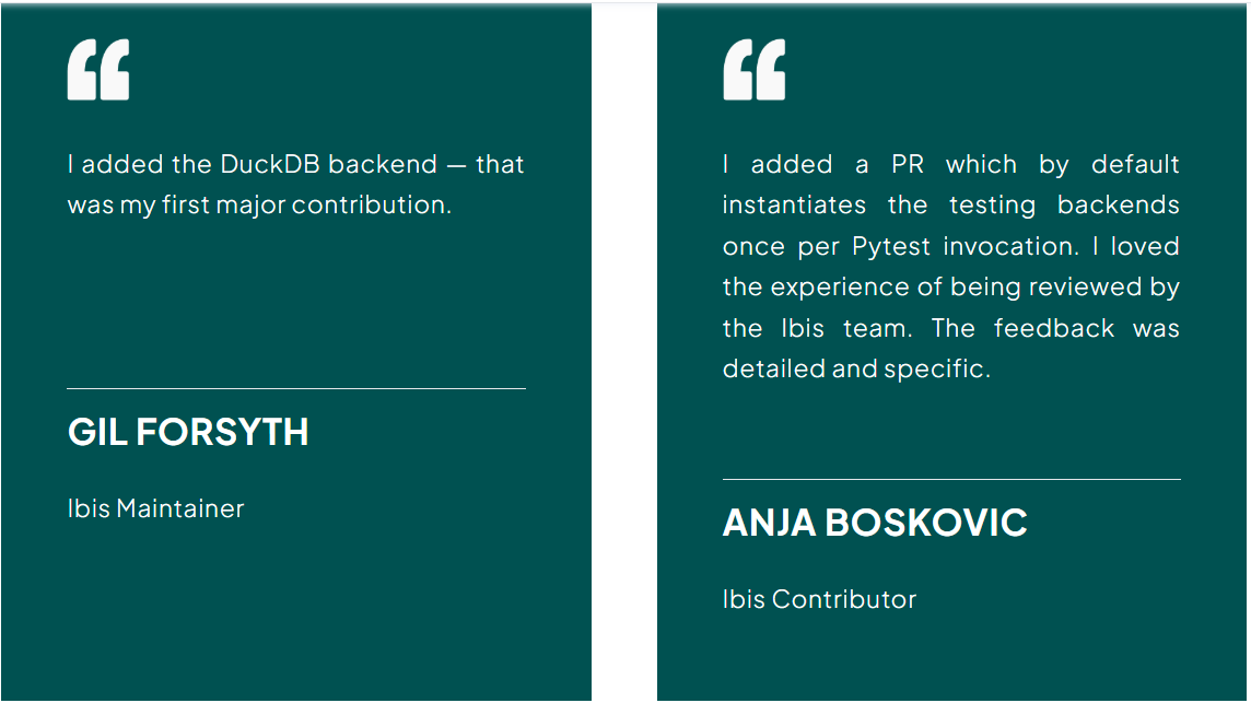 Phillip Cloud is the lead maintainer for Ibis and his work is particularly helpful for contributors to Ibis. Automating releases and reducing CI times not only makes contributing easier, but increases support for future technologies and backends. From simple documentation changes to adding a new backend to massive and complicated refactors, an improved CI and helpful feedback from the team makes contributing to Ibis a breeze.
