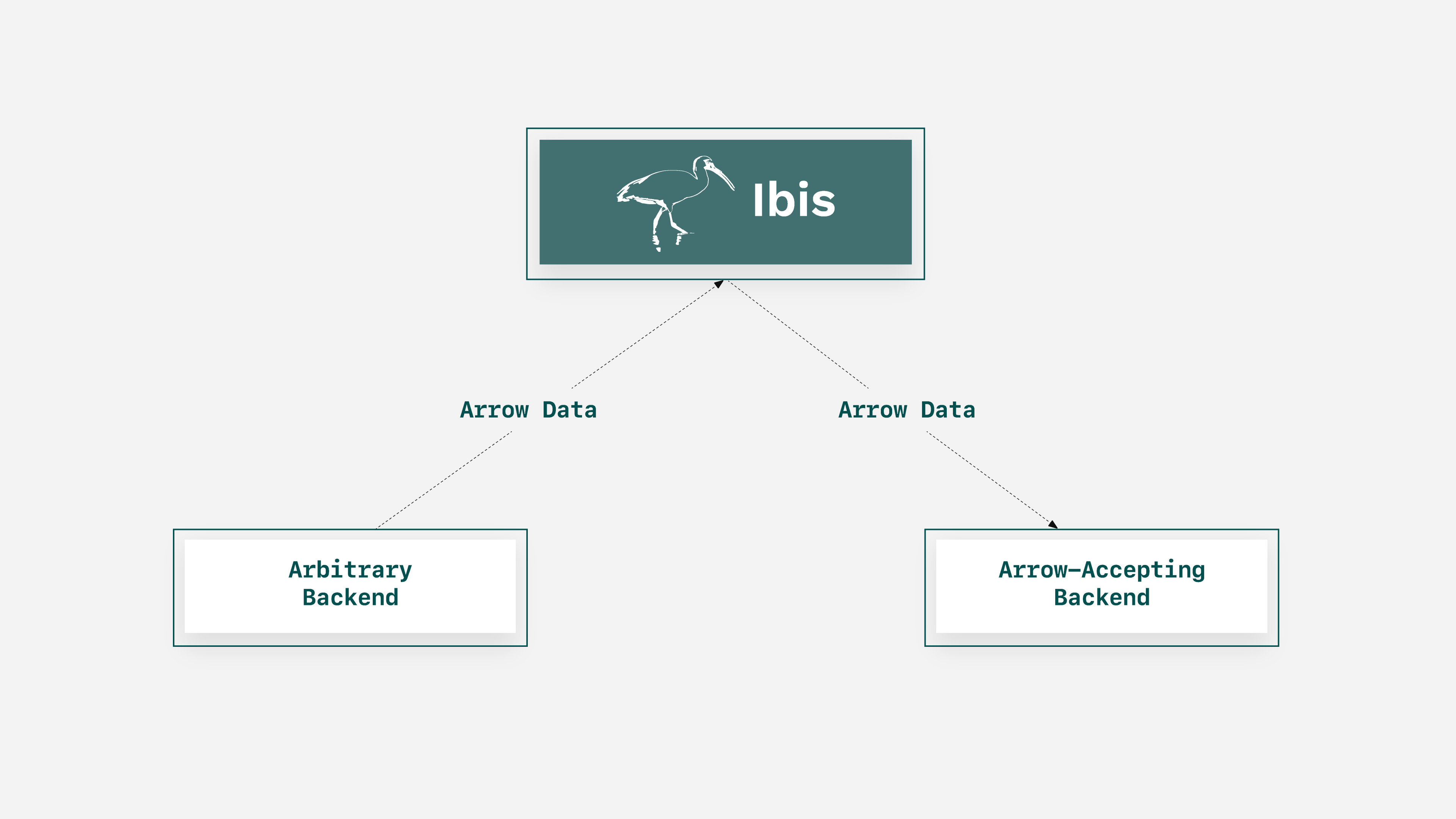 - Ibis can turn output from any query from any backend into Arrow data, and thus pass it into anything that accepts Arrow data.