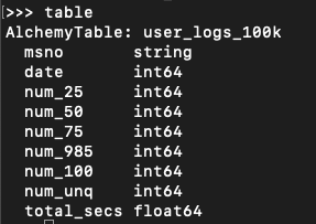 ) and we might want to know things like: the total number of seconds logged, the number of days the user was active, the total songs listened to, etc. Depending on the use case we may have different needs for different features, but it’ll be easy to construct these features with Ibis. Try out the following:
