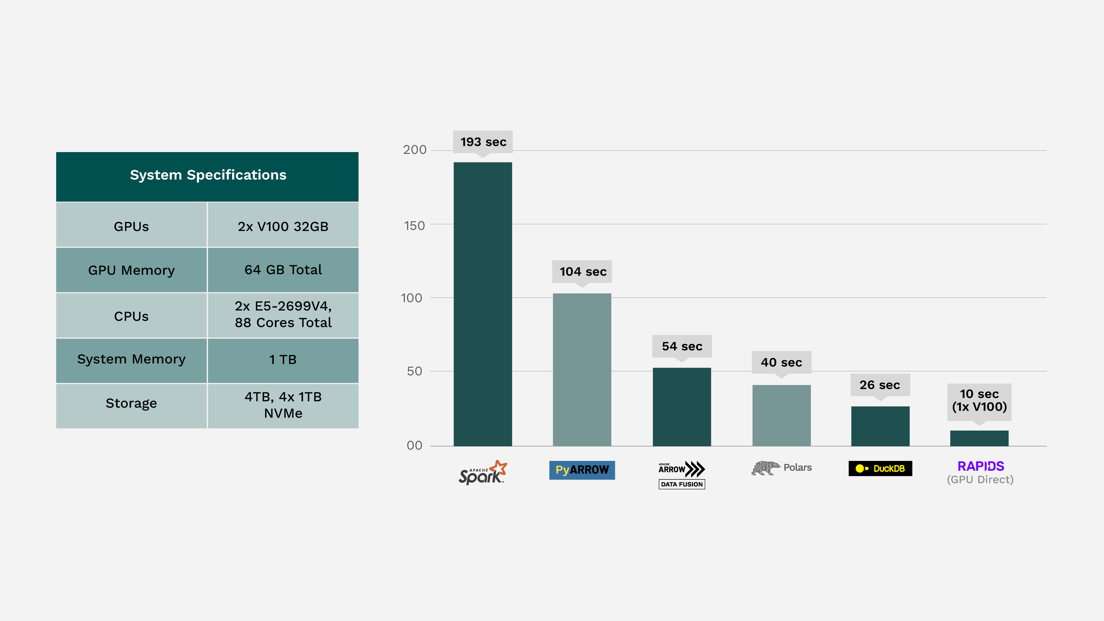 Both tests showed that Apache Spark was the worst performing backend regardless of hardware. Using GPU accelerated hardware, a single NVIDIA GPU is able to outperform 88 x86 CPU cores by at least ~2.5 times using a single NVIDIA V100. That means a single GPU outperforms Spark on an 88 core cluster by 20x. Most servers would have four to eight GPUs like these, so you can imagine the speedups as data increases.