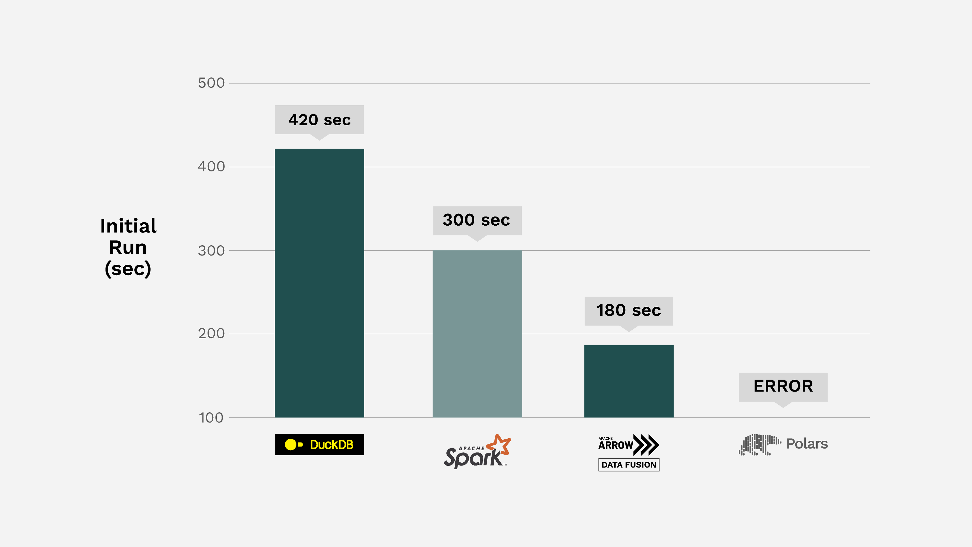 On John’s system (specification in chart), most backends were able to process the parquet file in under a minute. As expected the performance is hardware dependent and non-SQL solutions like Apache Arrow, and RAPIDS cuDF (tested using an NVIDIA GPU) saw considerable improvement.
