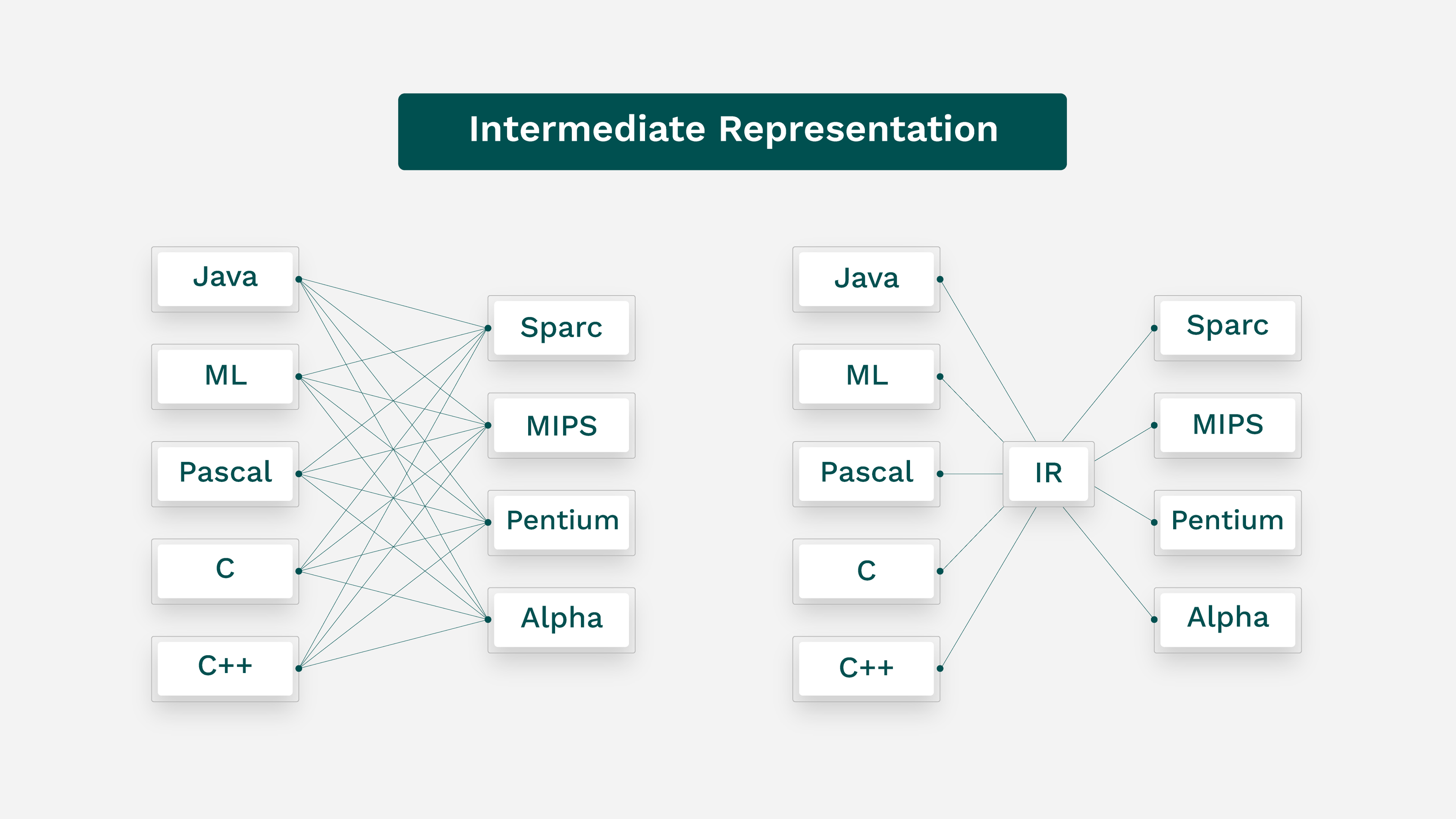 By mapping to a single middle point, you only need tools to move from each language to IR, and from IR to each hardware configuration. That’s one for each item, rather than one for each possible item pair. Thus, when you include a standard IR, supporting five languages and five hardware configurations requires 10 tools — five language-to-IR, five IR-to-hardware.