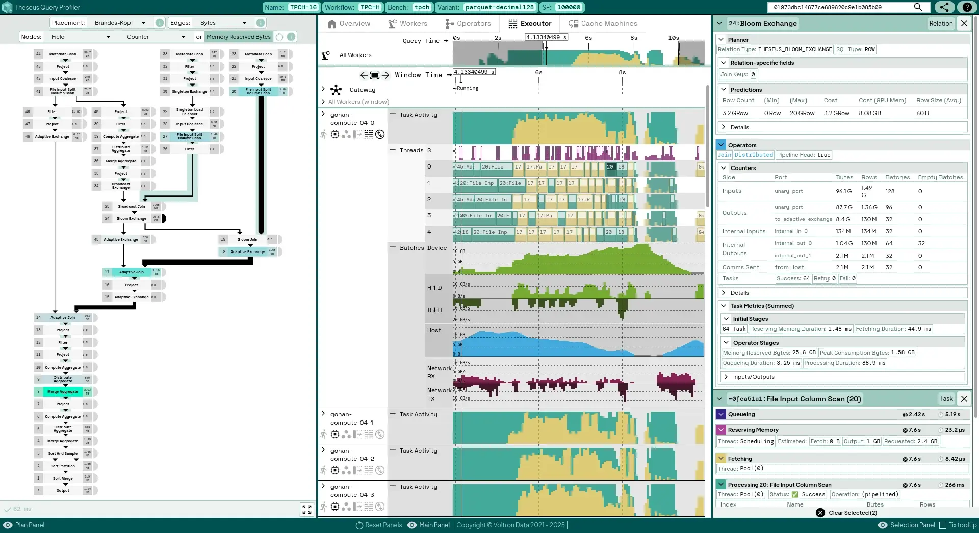 Theseus' Query Profiler app visualizes your query, allowing you to explore the query plan, how the engine executed it, and when data moved between workers and GPUs.
