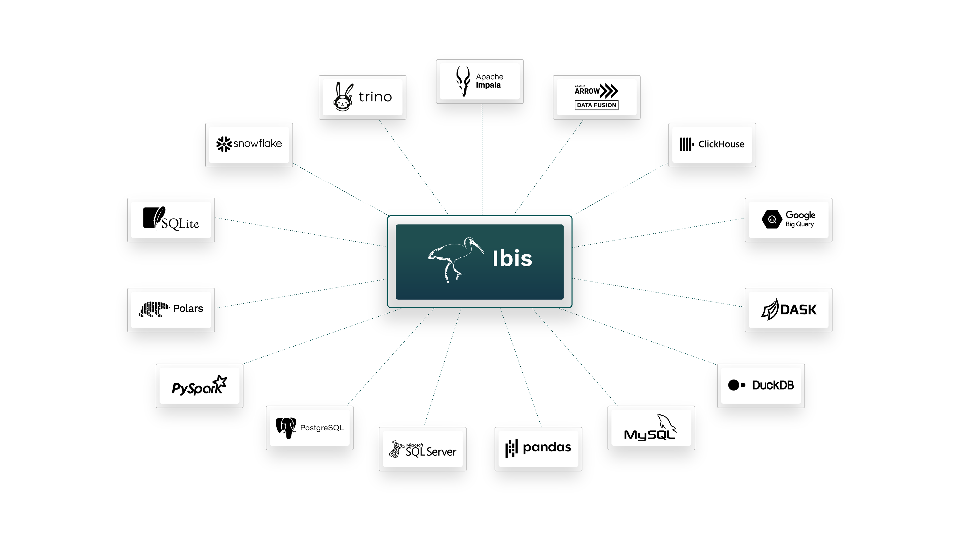 The first three (Impala, ClickHouse, Big Query) work the same as they turn the Python instructions you write into strings that are then executed as queries using the respective engines. The latter eleven (Dask, Datafusion, DuckDB, MS SQL Server, Polars, MySQL, PostgreSQL, PySpark, SQLite, Snowflake, and Trino) translate your Python instructions directly into API-specific languages provided by the execution engines. A final backend, pandas, directly executes the backend, as Pandas is a Python library.