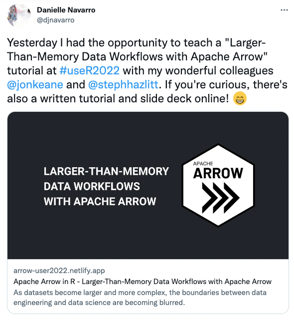 Meet Apache Arrow, a multi-language toolbox for working with larger-than-memory data. Started in 2016, the Arrow project is designed to allow data scientists to work efficiently with very large data sets in the programming language of their choice. To assist data analysts who work in R and want to learn more about Arrow, we’ve put together a tutorial on Larger-Than-Memory Data Workflows with Apache Arrow. On the website you’ll find a written tutorial, slides, and exercises designed to gently guide you along the learning journey. The content is aimed at learners who are new to Arrow but experienced with the R programming language. We first presented the material back in June to a group of 50 learners in a live online workshop that formed part of the useR! 2022 conference. However, the written content is designed to stand on its own. So if you’re having challenges working with larger-than-memory data in R, then the written tutorial and slide deck may be of interest to you.