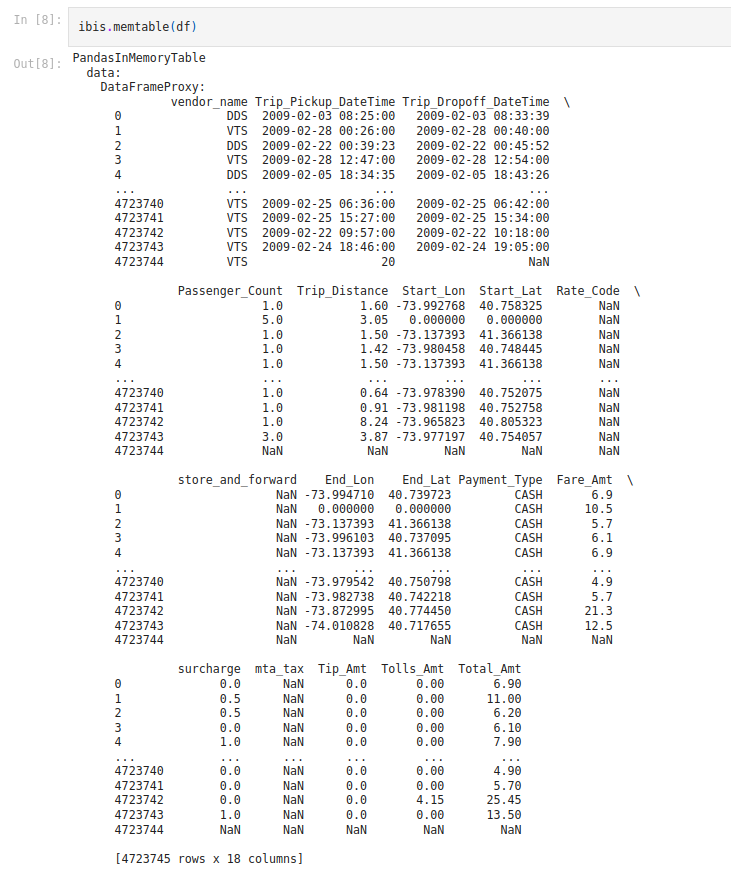 Memtable is a feature that gives Ibis users the ability to interact with Pandas dataframes as Ibis expressions in a convenient way. Memtable takes in a dataframe and creates an Ibis expression that stores it and can have SQL queries run on it. With larger datasets (100 million rows and above) running queries on dataframes this way becomes significantly more performant than using Pandas for the same operations. Currently, DuckDB is the default backend, with ClickHouse being natively supported as well. Let’s see some examples of what this looks like with code.