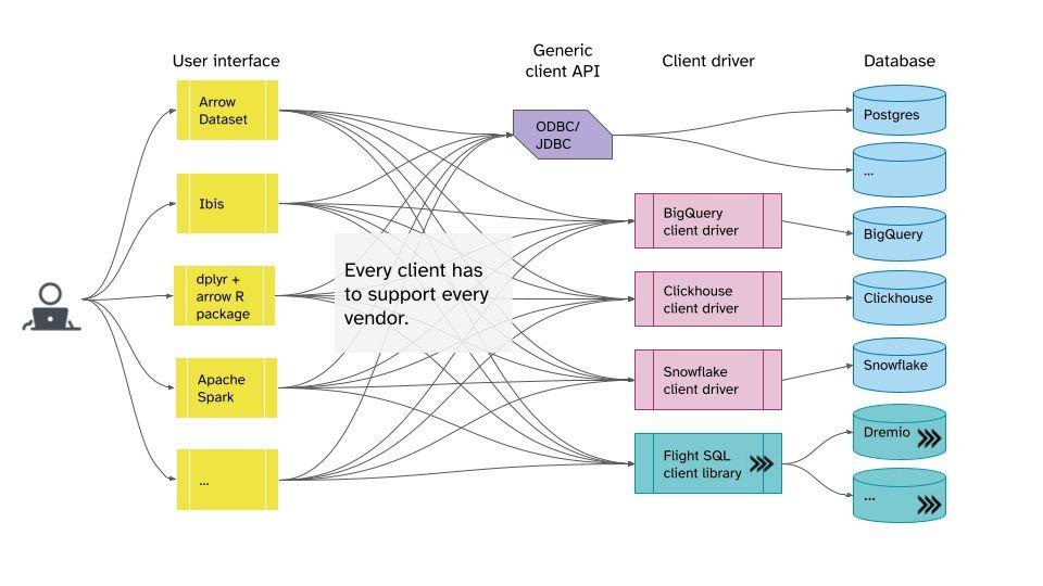 Some systems like Dremio, Google BigQuery, and Snowflake offer Arrow-native data access. But each of them has a different API, and that means extra code for each case. Flight SQL alone cannot help here. It would be like directly using libpq to talk to Postgres: it’s low level, and only helps if the database vendor implements it. And if not, it is hard for a client to retrofit it onto an existing database because it is a “full stack” solution.