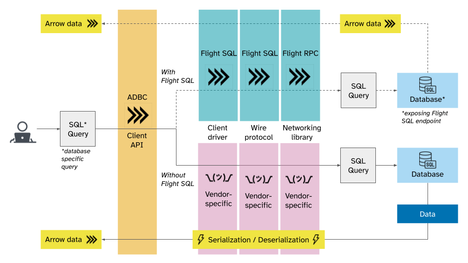 Flight SQL aims to help database vendors that already support columnar data, but would currently have to design their own wire protocols, or bend existing ones to their will. ADBC aims to help database clients that currently have to write specialized code for connecting to each database they want to use, even if all they want is Arrow data in the end. Together, they make getting to a fast, Arrow-native future easy.